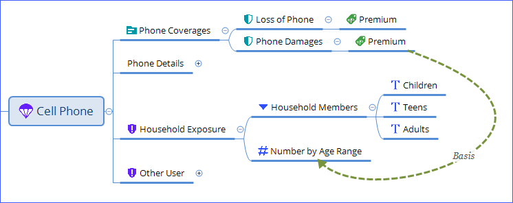 In the mind map, define an exposure and exposure fields. In this example, the Cell Phone risk object has a Household Exposure with Household Members drop-down list. Household members can be Children, Teens, or Adults. The exposure also has a Number by Age Range number topic where you can specify the number of household members in a particular age range.