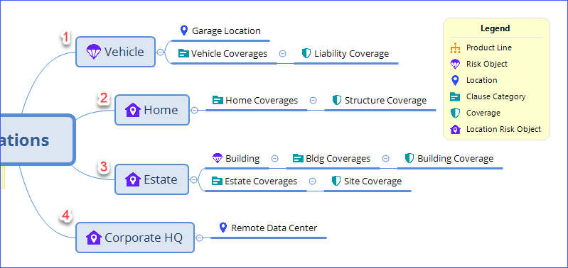 In the visualized product, you can add one or more instances of a risk object to a policy. For example, you have a cell phone risk object in a mind map. In a policy transaction, you can add one or more cell phones to the policy.