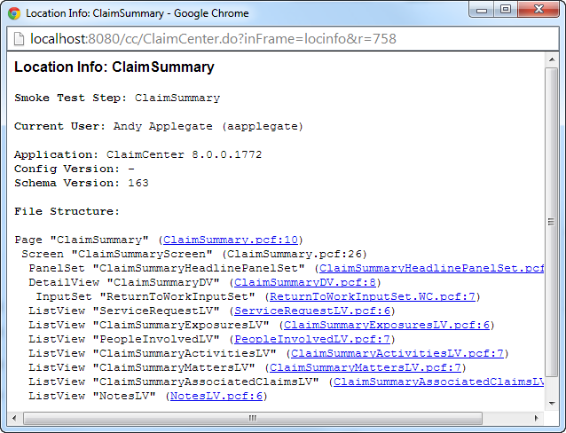 To view the location information for a particular page, go to that page in the PolicyCenter interface, and then press Alt+Shift+I. This opens the Location Info window for the active page. For example, the following is the Location Info window for the ClaimCenter Claim Summary page: