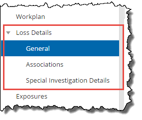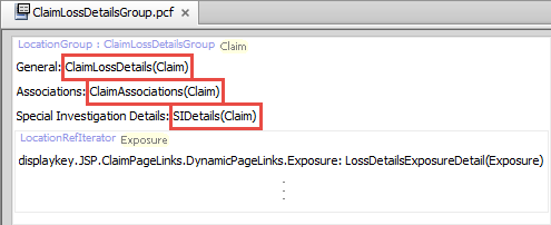A location group can be used to define navigation items that appear in the sidebar. As an example, consider the claim Loss Details page in the following diagram: