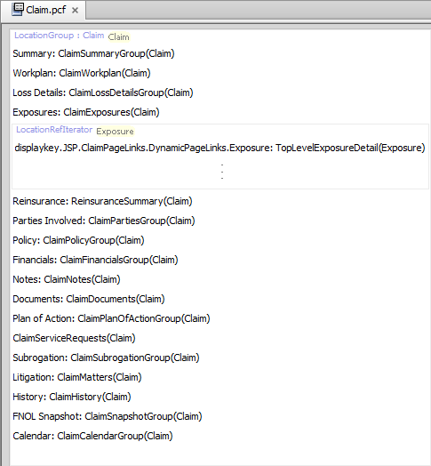 A location group must contain one or more references to another location. Any time that you navigate to the location group, PolicyCenter uses the locations defined within it to determine what page and surrounding navigation to display. The following example is the location group defined for a claim in ClaimCenter: