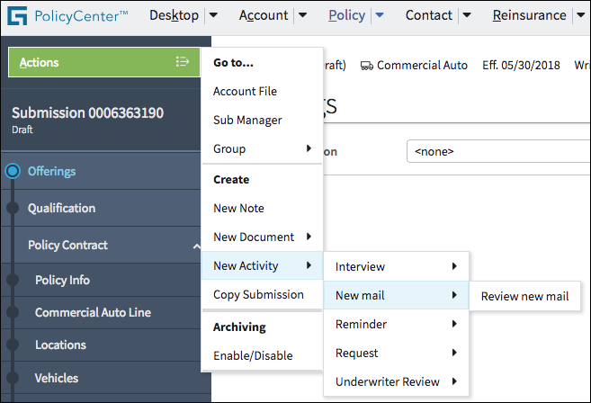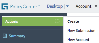 The Actions menu is a contextual menu residing in the upper left part of the screen. Actions menu operations change as users navigate to key sections within InsuranceSuite applications.
