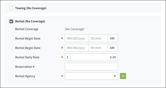 Use an input group when users need the ability to show or hide inputs or input sets. In the following screen shot, the information under Towing is hidden while the information under Rental (No Coverage) is visible.