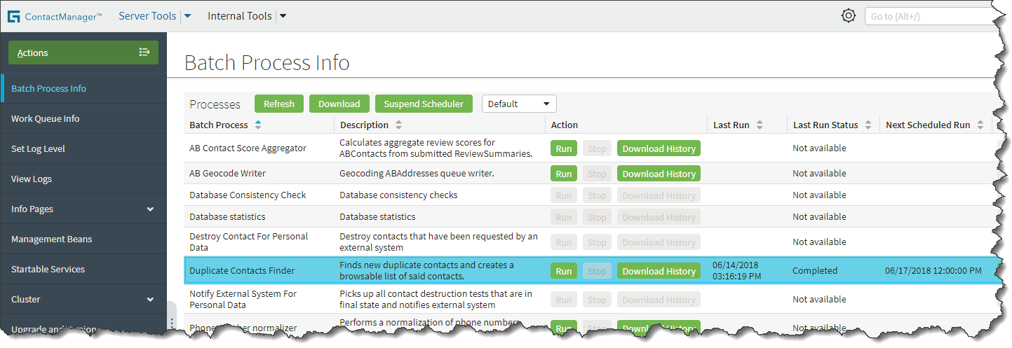 The Batch Process Info screen enables you to run work queues and batch processes manually, without having to wait for the scheduled writers to run. You can start ContactManager processes and view information about them, including writers for work queues. This information includes the Name, Description, Status, Last Run time, Last Run Status, Next Scheduled Run time, and scheduling information.